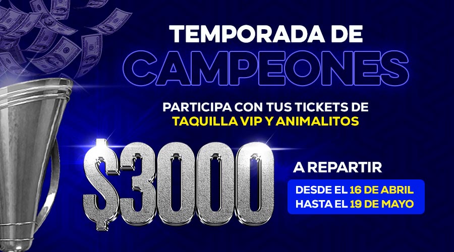 - SEMANA 5 (del martes 14 al domingo 19 de mayo) Entrega de la copa "Temporada de campeones": $500 a la persona que más tickets realizó en la sección de animalitos y otros $500 a la persona que realizó más tickets en la taquilla VIP desde el inicio de la temporada hasta el final de la misma. Estos premios se anunciarán el lunes 20 de mayo a través de un Instagram Live.